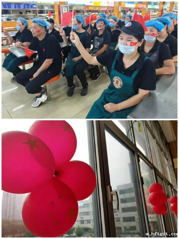活动现场气氛庄重而热烈。餐厅提前进行了布置,悬挂了国旗,巨大的屏幕上播放着阅兵式的恢弘场面。当激昂的国歌奏响,全体员工自发肃立,齐声高唱,表达对祖国的无限热爱与崇高敬意。